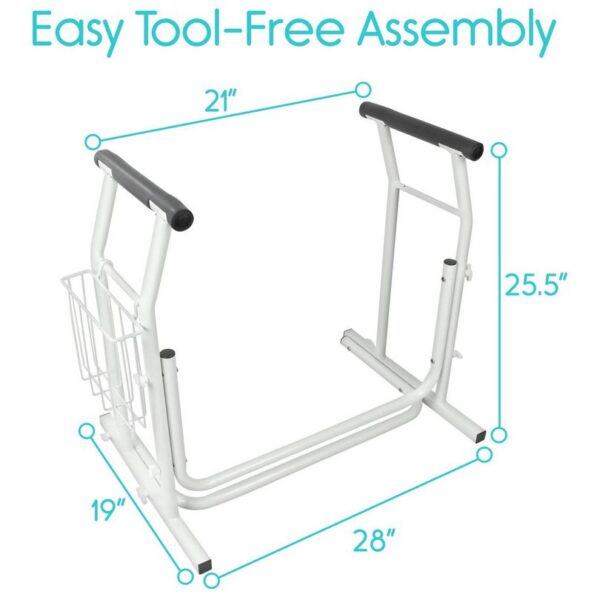 - EASY TOOL-FREE ASSEMBLY: The freestanding toilet rail is easy to assemble: no tools required. Handles can also be easily removed for convenient storage. Lightweight and durable, the frame is corrosion resistant, perfect for long term use.