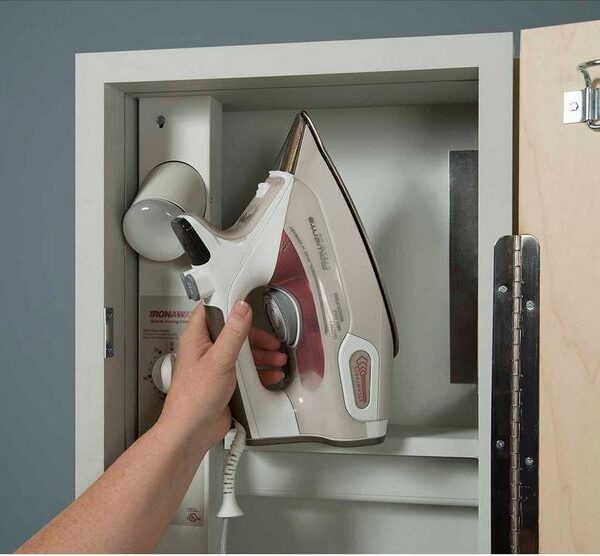 - Electrical raceway allows you to plug your iron directly into the unit with an outlet powered by a 60 minutes timer and accompanied by a spotlight and a safety disconnect switch that cuts the power to the unit when the board is in an upright position