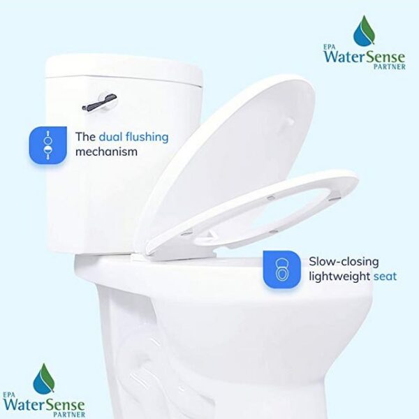 - Dual flush valve 1.28 GPF of water for solid waste and 0.9 GPF for liquid