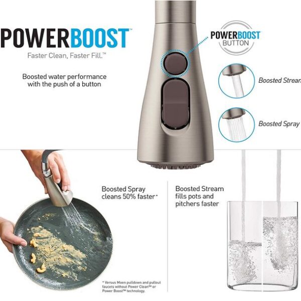 - BOOSTED STREAM: Moen’s exclusive Power Boost technology offers a faster clean and faster fill with the push of a button