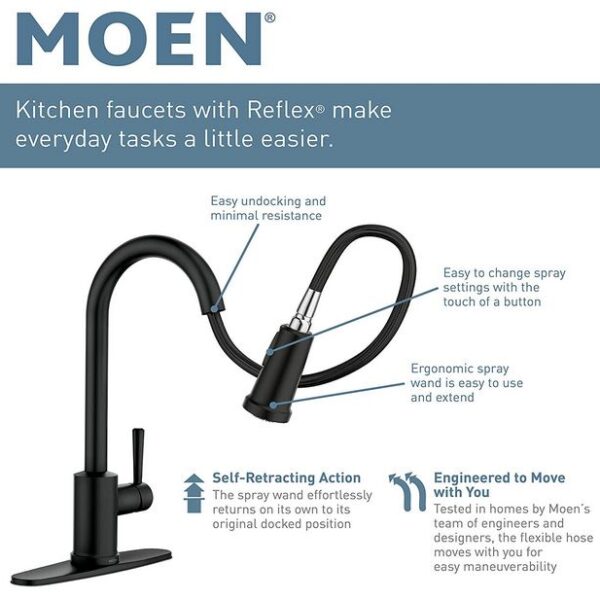 Understated style boasting versatile functionality meets its match in this kitchen faucet with pull down sprayer. The Arbor Single Handle Faucet features Reflex Technology which provides smooth operation, easy movement and the pull out faucet’s sprayhead easy docks into place. Like most Moen kitchen faucets, it’s constructed with the highest standards and offers a Limited Lifetime Warranty against leaks, drips and more.