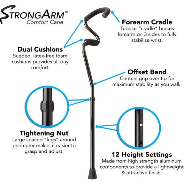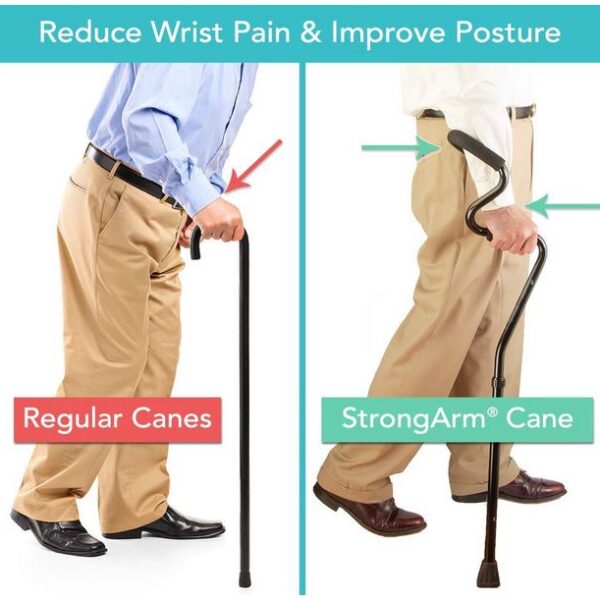 - STRONGARM DIFFERENCE: The StrongArm Comfort Cane offers an innovative patented design that shifts the weight from your wrist to the forearm providing optimal stability, support and comfort as you walk. StrongArm supports the strength of your body to dramatically improve your posture, help you move easier, all without the stain & pain you feel from the average walking cane. The revolutionary handle encourages you to walk upright and change your line of sight so that you look forward instead of do