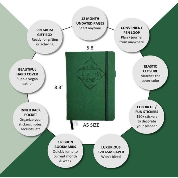 Adventure Planner Undated 12 Month Daily, Weekly & Monthly Planner to Achieve Your Goals, Improve Your Health, Increase Productivity and Live an Adventure-Filled Life – Start Anytime, A5, Green