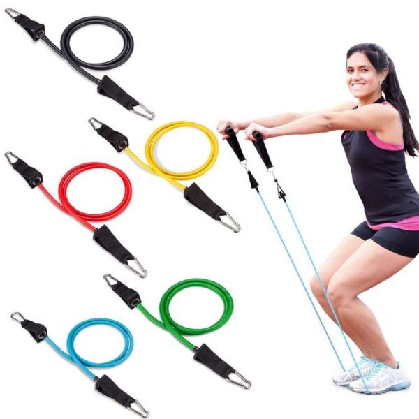 - Stackable bands for adjustable resistance levels. Comes as a set of 5, 48-inch long colored exercise bands. Yellow, Red, Green, Black, and Blue bands can also be combined together to provide up to 120 lbs of resistance. Metal clip system allows you to attach the included soft-grip handles or ankle straps for a more comfortable workout.