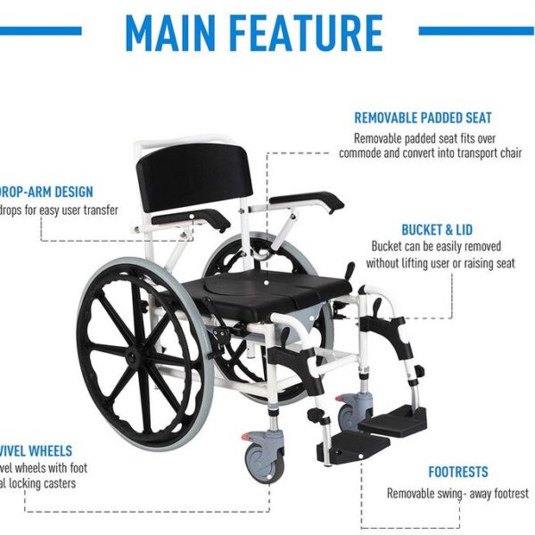Categories: Activities of Daily Living (ADLs) Products and Equipment, Bariatric Equipment, BASIC ADLs, Bath and Shower Mobility Aids, Bathing, Bedroom Mobility Aids, Caring for Someone With Incontinence, Functional Mobility, Home Care Aide Products and Equipment, Home Healthcare Professionals, Maintaining Control Over Urination and Release of Stool, Remote Toileting Receptacles, Rolling Commode/Shower Chairs, Toileting, Toileting Assistance, Wheelchairs and Mobile Chairs