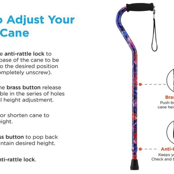 - BEAUTIFUL, LIGHTWEIGHT & ADJUSTABLE walking cane has an offset handle design that provides optimal support and comfort for the arm and wrist. Adjusts from 28” – 39” for approximate user height: 4’11” – 6”4”. Weighs only 1 pound with a 300 lb weight capacity