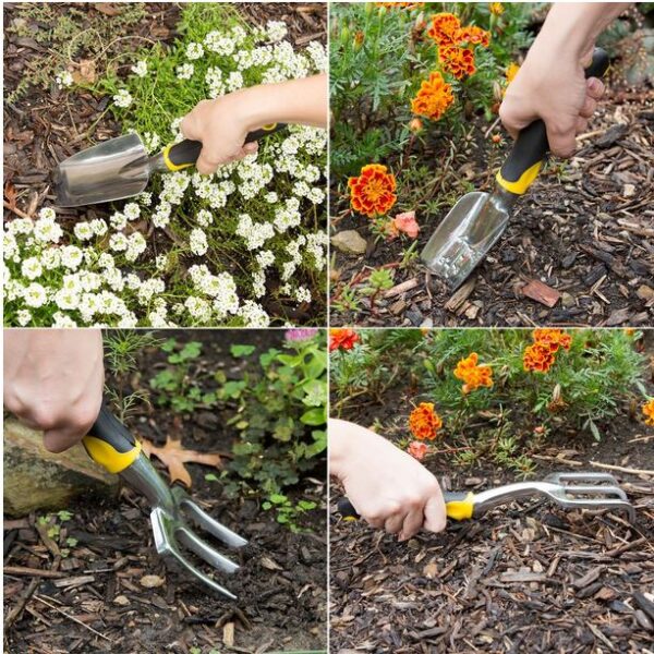 - 4 piece garden tool set includes: 1 cultivator, 1 transplanter, 1 trowel, 1 fork