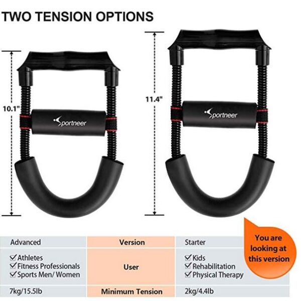 Compared with the Advanced version of 10.1inch wrist strengthener, This Starter version wrist exerciser has been extended to 11.4 inch to be softer, the MINIMUM TENSION is about 2kg / 4.4lbs. Therefore, it applys to beginners, women, kids, and is suitable for physical therapy and other people who need to increase muscle strength.