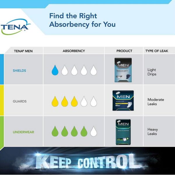 Moderate and Secure Leakage Protection for MenYou are not alone: 1 in 4 men experience incontinence. TENA MEN Moderate Incontinence Guards are designed with the absorbency and incontinence leakage protection you need to get back into your running shoes or regular routine and live life with confidence. |