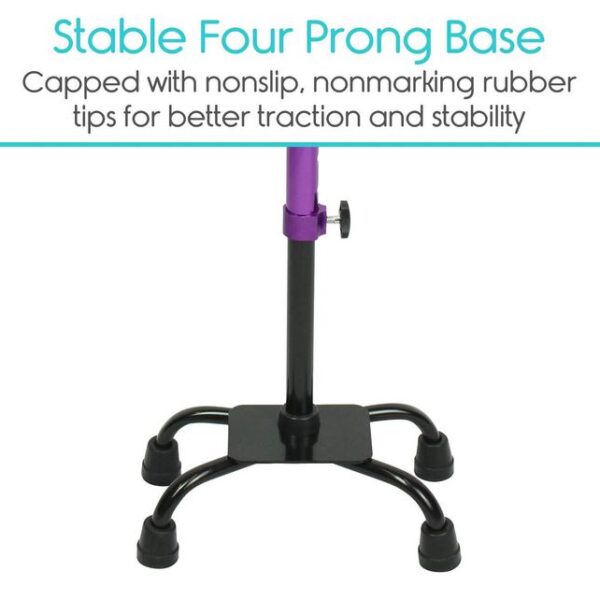 Easily switching from the left to right side, the four prong base locks into place providing additional support without interfering with a normal stride. Each prong is capped with a rubber, non skid, non-marking tip for added stability and convenience. The square base allows the cane to stand upright while remaining compact enough to easily fit on stairs or in narrow passageways.