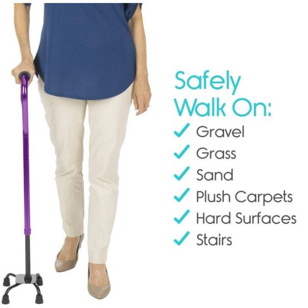 - SUPERIOR STABILITY AND TRACTION ON ANY SURFACE: Safely navigate over any surface, indoors and out. The quad cane base provides greater traction on smooth surfaces such as hardwood, laminate or tile floors as well as greater stability on uneven surfaces such as grass, sand, gravel or plush carpets. The versatile cane is made with a durable anodized aluminum frame that is adjustable from 28” to a maximum of 37” and supports up to 250 pounds.
