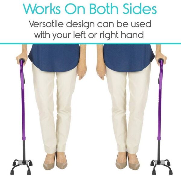 Safely navigate any surface with the Vive adjustable quad cane. Providing greater traction and stability on uneven surfaces, the quad cane uses a strong base with four prongs capped by non-marking, non skid tips. Easily adjust the height of the cane as well as the base for left or right handed use. A contoured handle provides a secure, yet comfortable grip on the lightweight, corrosion-resistant frame.